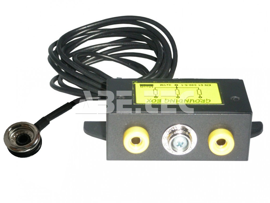 - Grounding box with two banana sockets, 1 patent 10 mm, termination patent 10 mm, internal resistors 1MΩ.