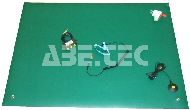 The workplace consists of an antistatic work area, earthing box with three sockets, protective wrist strap and earthing plug.